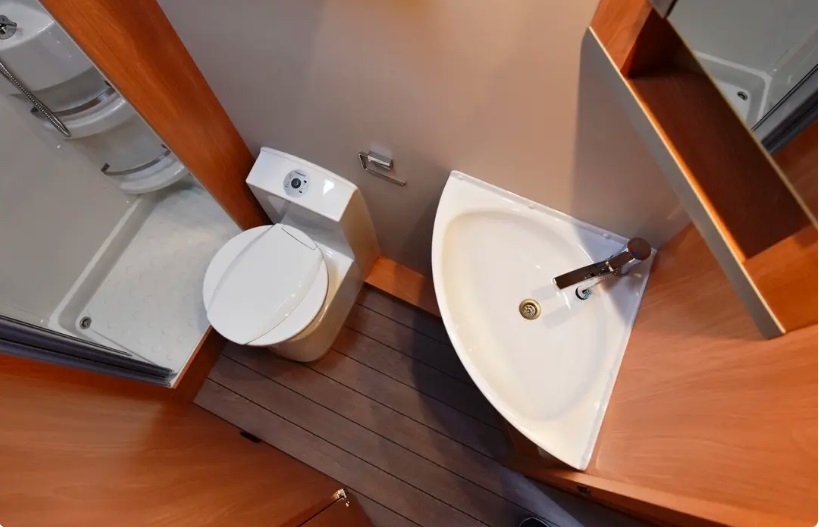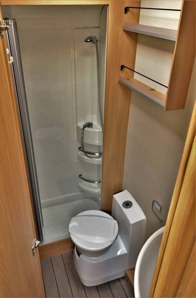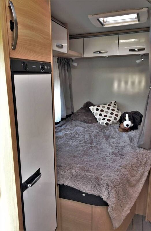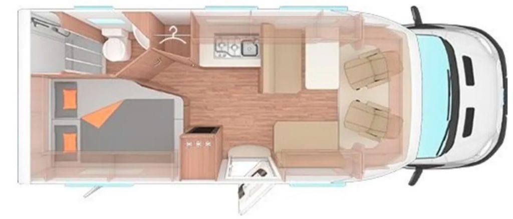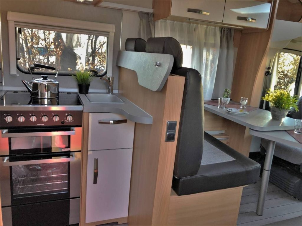 Der Grundriss ist ähnlich wie der Knaus Wave 650 oder der Weinsberg Cara Suite 650 MF, durch die größere Gesamtlänge ist bei unserem Hugo aber sowohl das Badezimmer mit der eigenen festen Duschkabine, als auch die Küche mit einem 4-Flammen Gaskocher, einem integrierten Grill und Backofen spürbar größer.