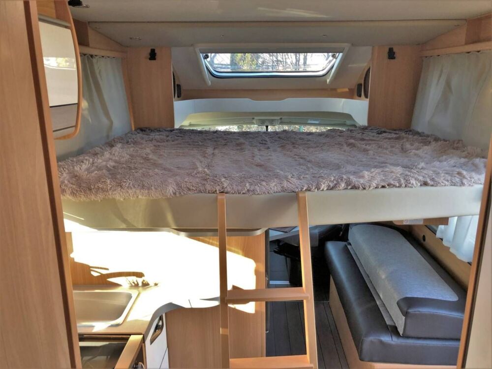 Hugo hat neben dem festen französischen Längsbett (195x140cm) mit klappbarer Beinverbreiterung noch ein sehr geräumiges Hubbett mit identischen Abmessungen über dem Wohnbereich, unter dem ich im hochgefahrenen Zustand trotz meiner Körpergröße von 1,92cm noch normal aufrecht stehen kann..